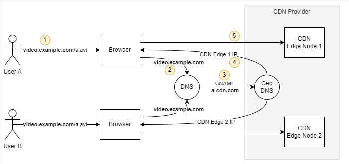 - 用户通过浏览器请求一个资源,如在video.example.com上的一个视频a.avi。