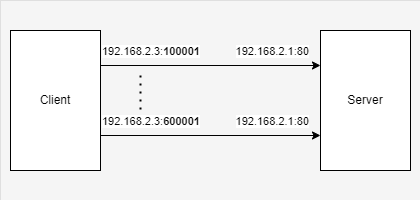 一个TCP连接由4个因素决定:源IP,源port,目标IP和目标port。在一个client向server的某服务建立连接的例子中,这个client能够建立的最大连接数将受限于6万个左右,因为源IP,目标IP和目标port是固定的,可变的只有是源port,但它最大不能超过65536,所以最多大约是6万个连接。