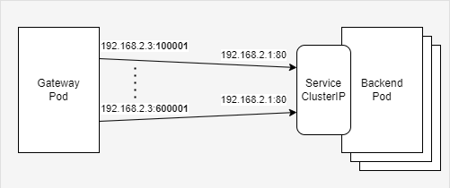 后端服务通过Service暴露给网关节点。K8S内置的基于DNS的服务发现将Service端点主机名解释成固定ClusterIP。对单个网关节点来说,源IP,目标IP和目标port是固定的,可变的只有是源port,连接数最多大约是6万个。要突破限制,其中一个办法是扩展目标IP。