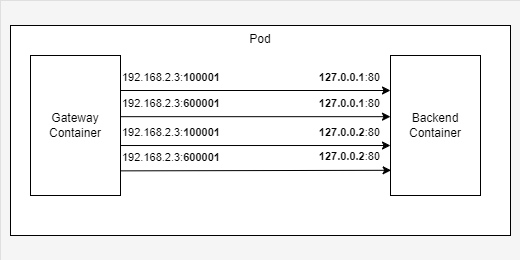 更极端的做法是,将网关和后端服务放进同一个Pod中作为两个Container,它们将共享网络。增加本地loop_back地址,以使得网关Container可以通过不同的本地地址连接到后端服务Container。
